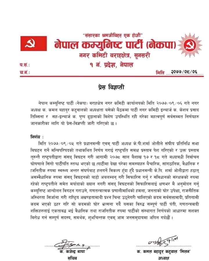 मनोज बिष्ट /बराहक्षेत्र / नेपाल कम्युनिष्ट पार्टी (नेकपा) बराहक्षेत्र नगर कमिटी, सुनसरीले संघीय संसद भंग गर्ने असंबैधानीक निर्णय नसच्याए अधिनायकवादी शासकहरुविरुद्ध आन्दोलन गर्ने चेतावनी दिएको छ ।