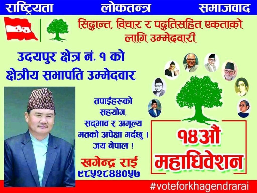 नेपाली कांग्रेसको चौधौं महाधिवेशन सुरु भयसगै उदयपुरमा चहलपहल सुरु भएको छ । उदयपुरको निर्वाचन क्षेत्र नम्बर १ को सभापतिमा युवा नेता तथा चौदन्डिगडी नगरपालिकाका मेयर खगेन्द्र राइले आफ्नो उम्मेद्बारी घोषणा गरेको छ्न ।