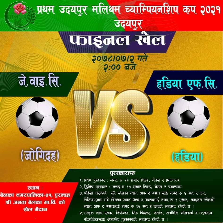 जोगिदह यूथ क्लब,जोगिदह र हडिया फूटबल क्लब , हडिया फाइनलमा प्रबेश गरेको छ । प्रतियोगितामा उदयपुरका जम्मा ८ ओटा टीमले भाग लिएका थिए।