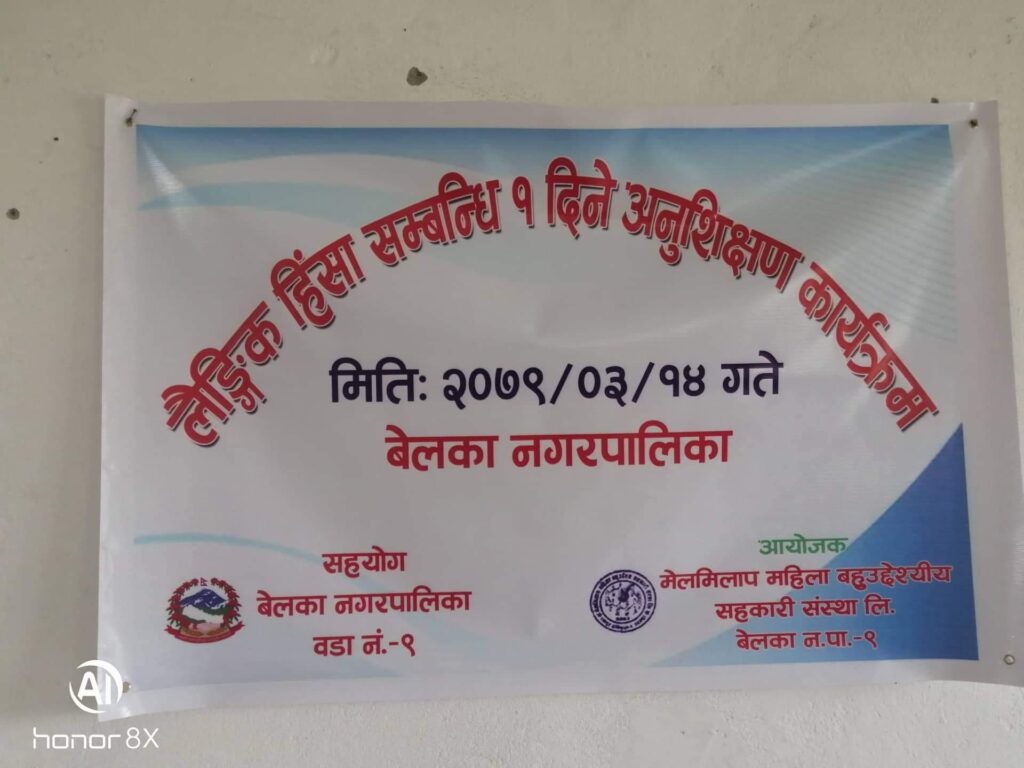 बेलका नगरपालिका मेलमिलाप महिला बहुउद्देश्यीय सहकारी संस्थाले १ दिने लैङ्गकि हिंसा तथा प्रजनन स्वास्थ सम्बन्धिको अनुशिक्षण कार्यक्रम सम्पन्न गरेको छ। उप-प्रमुख जिरा राई ,वाड अध्यक्ष पदम खड्का तथा नगर कार्यपालिकाका महिला सदस्यहरु लगायत अन्य वाड्का सदस्यहरुको आतिथ्यतामा उक्त कार्यक्रम सम्पन्न भएको हो। संस्थाले आफ्नो संस्थाको सदस्यहरुका साथै अन्य महिलाहरुलाइ उक्त कार्यक्रममा प्रशिक्षण गराएको थियो । बागमती सेवा समाज अन्तर्गतको क्रीस नामक संस्थाका प्रतिनिधिहरुले समेत महिलाहरुको प्रजनन स्वास्थका बारे जानकारी दिएका थिए। कार्यक्रममा बोल्दै उप-प्रमुख जिरा राईले गएको निर्वाचनमा आफ्नो प्रतिस्पर्धा पुरुषसङ हुदा महिलाहरूले आफ्नो हकाधिकार र महिला नेतृत्वको महत्त्व बुझेर आफुलाइ मत दिएका कारण जित सुनिश्चित भएको र महिलाहरुमा चेतनाको विकास भएको भनि धन्यवाद ज्ञापन गर्दै र आगामी दिनमा महिला हकाधिकारका निमित्त आफ्नो स्थानबाट सक्दो सहयोग गर्ने प्रतिबद्धता समेत ब्यक्त गरेकी छन।