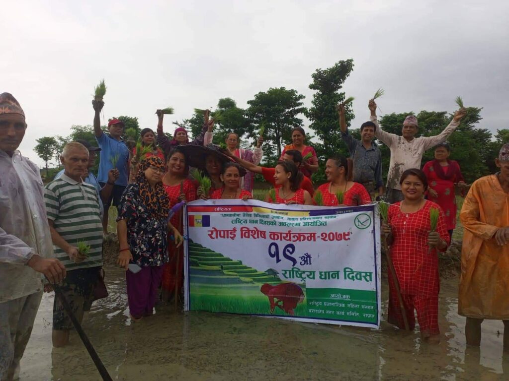 ” धानवालिमा जैविक बिबिधताको उपयोग, आयात प्रतिस्थापनमा सहयोग ०७९” भन्ने नारालाई आत्मासात गरेर सरकारले १९ औं राष्ट्रिय धान दिवस भब्यताको साथ मनाउने अभियानलाई साथ दिदै सामूहिक धान रोपाइँ कार्यक्रम आयोजना गरिएको महिला सङ्गठनका अध्यक्ष कुमारी बस्नेतले बताइन् ।