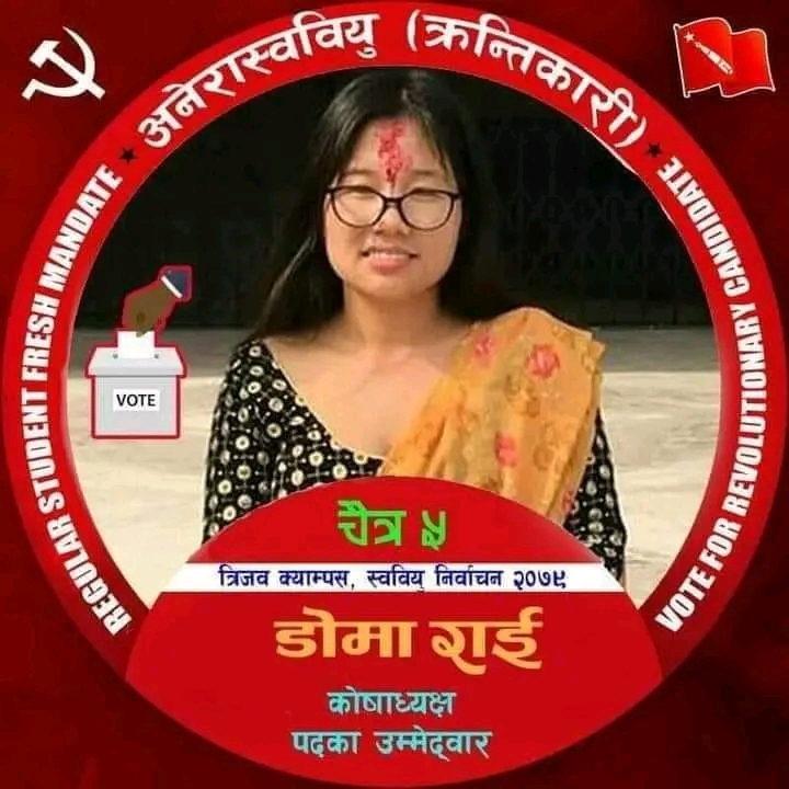 सामाजिक तथा राजनीति क्षेत्रमा एउटा छुट्टै नाम हो’ डोमा राई । उनी चैत्र ५ गते हुने स्ववियु निर्वाचनमा त्रियुगा जनता बहुमुखी क्याम्पस अखिल क्रान्तिकारीको तर्फबाट कोषाध्यक्ष पदको उम्मेदवार हुन् ।