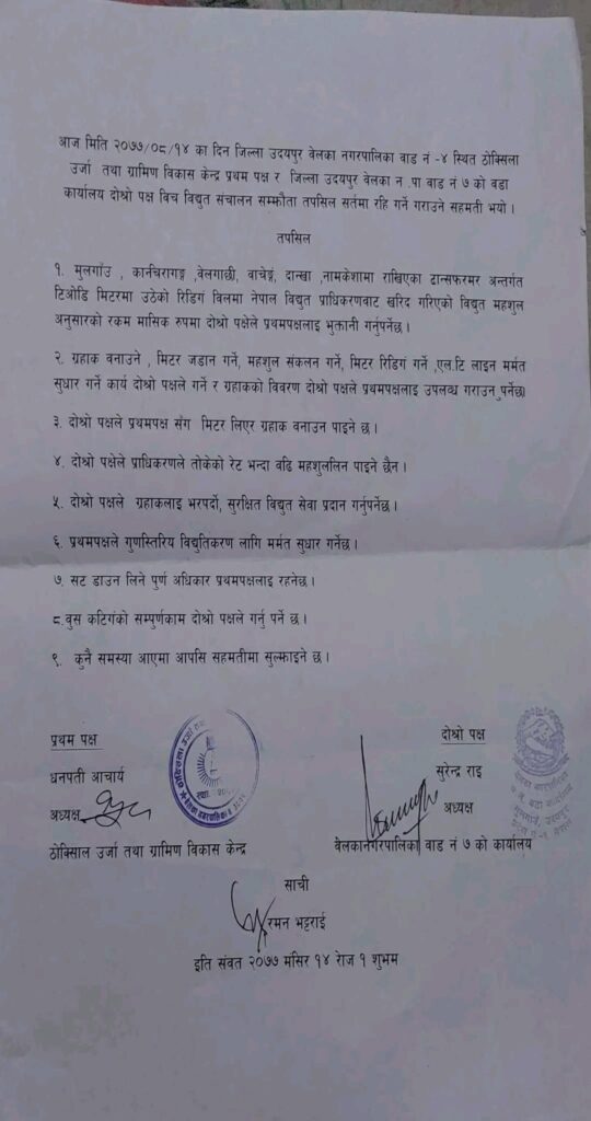 ठोक्सिला उर्जा तथा ग्रामीण बिधुतिकरणले सस्थागत रूपमा बेलका -७ सग बिधुत सम्झौता गरेको पाइएको हो। सम्झौता पत्र अनुसार महसुल नतिर्दा विधुत प्राधिकरणले सूचना जानकारी गराएर यो असार मसान्तसम्म लाइन काटने बताइएको छ ।